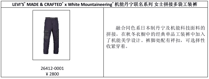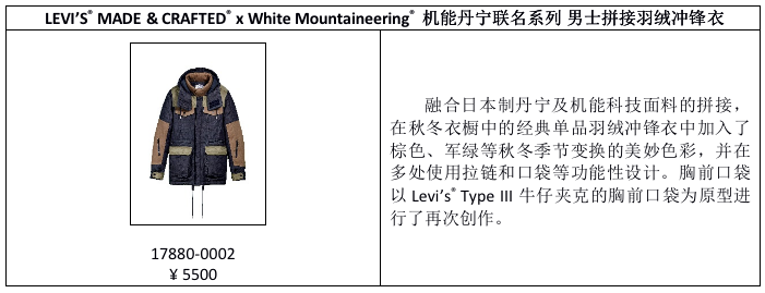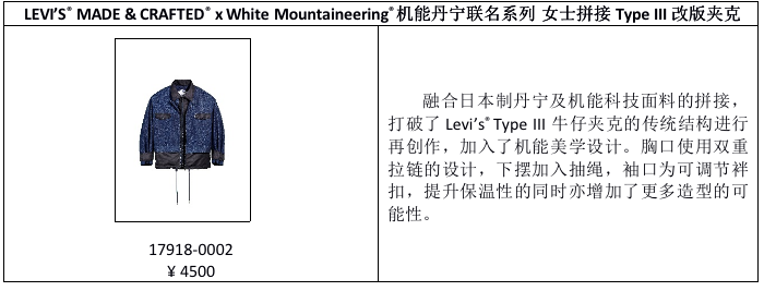 LEVI’S® MADE & CRAFTED® × White Mountaineering®联名胶囊系列将White Mountaineering® 的设计语言——兼具时尚与功能,糅合创新与工艺的风格,与LEVI’S® MADE & CRAFTED® 午夜蓝牌系列的经典传承及精湛技艺相结合,为本系列包括夹克、风衣、多袋工装裤和连衣裙在内的男女装服饰注入活力。该系列中,Levi’s® 经典的冬季丹宁单品,如鱼尾派克风衣、多袋工装裤、M65夹克等,结合高机能科技面料、实用性设计以及White Mountaineering® 标志性的硬朗造型,为街头美学注入全新灵感。此外,双方更试图打破Levi’s® 经典单品的固有形式, Sunset工装衬衣、Type III牛仔夹克及505™ 牛仔裤,融合了Levi’s® 丹宁的百年沉淀及White Mountaineering® 对机能美学的极致追求。