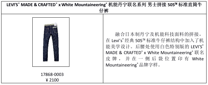 本系列产品采用多种优选面料和时尚元素,巧妙碰撞出别具一格的动感风格:对Levi’s® 复古标志性的Sunset系列立领衬衫的重新诠释;高机能科技感演绎经典女士夹克,尼龙腰带助力摩登型格;丹宁和尼龙混合面料打造的全新Levi’ s® 505™ 牛仔裤等。同时,该系列产品于多处细节应用联名元素,不仅采用了绘有White Mountaineering® 图案的LEVI’S® MADE & CRAFTED® 午夜蓝牌系列双马皮标,与此次联名相关的合作故事也在产品内部标签上被娓娓道来。