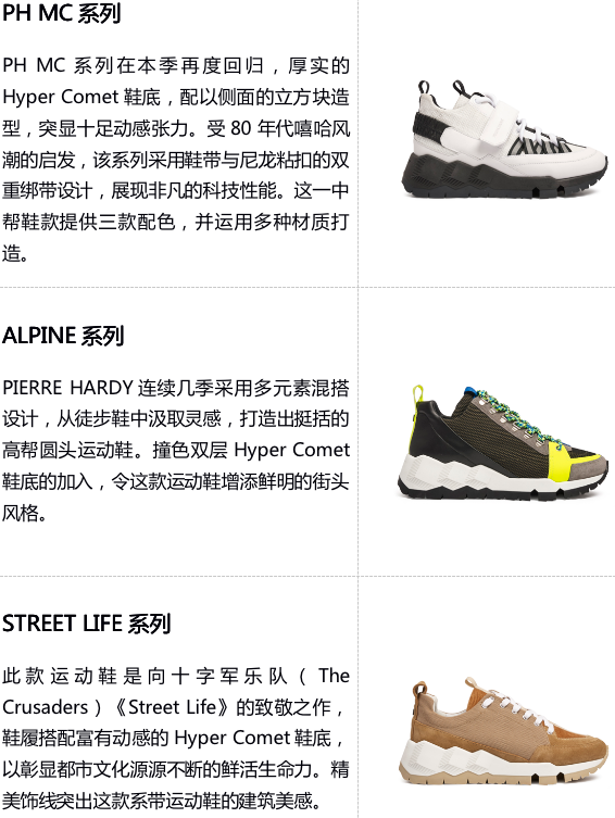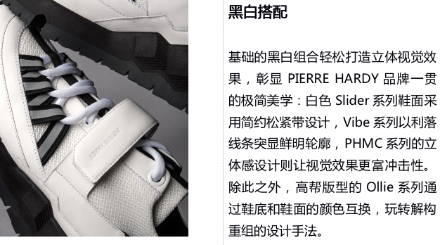PIERRE HARDY 2020秋冬男士系列对更多鞋履风格进行灵感探索。从滑板文化到摇滚皮靴,再到重新演绎的老爹鞋,PIERRE HARDY延续了其在款式设计与实穿性上的先锋探索,呈现多种元素间的碰撞与融合。