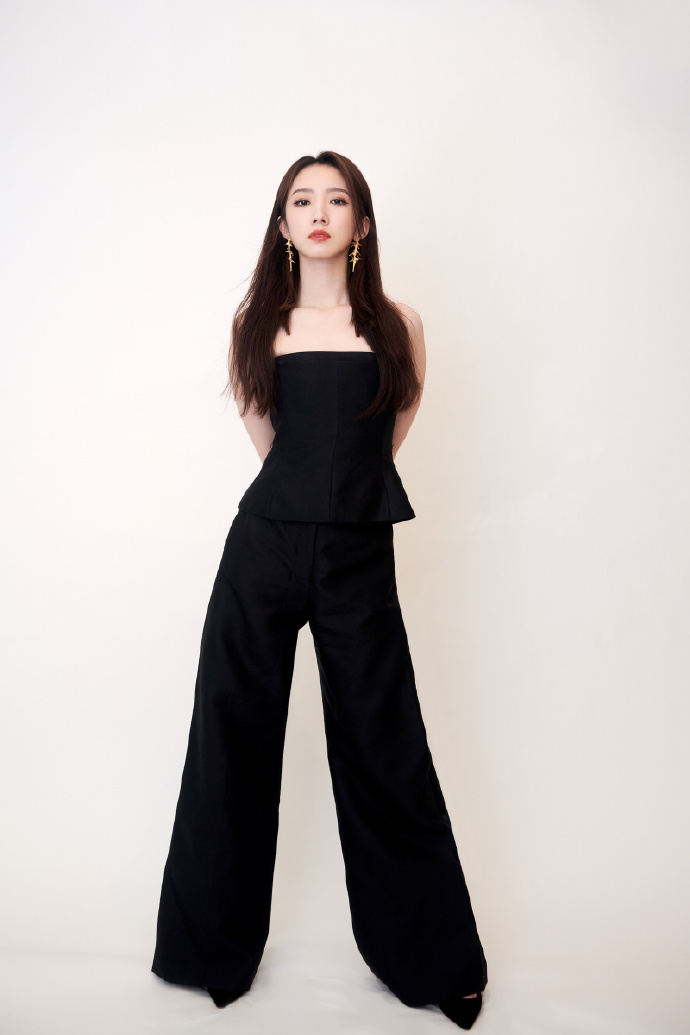孟美岐活动造型,身着all black抹胸西服套装,金色配饰更显出高级质感,尖头皮鞋拉长视觉,本来就瘦的孟美岐,显得更加窈窕纤细了。
