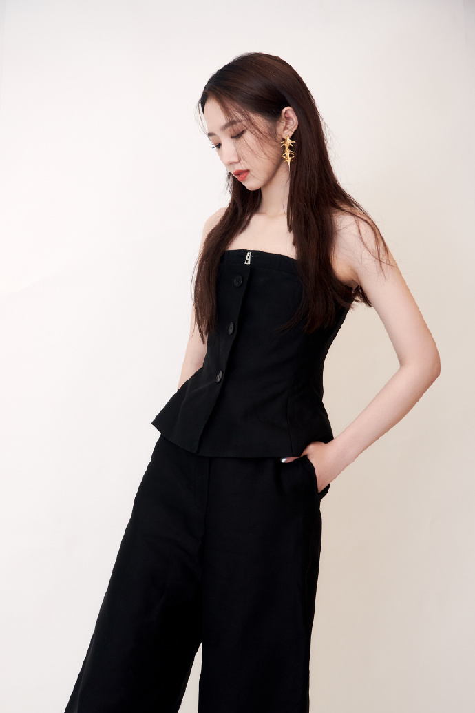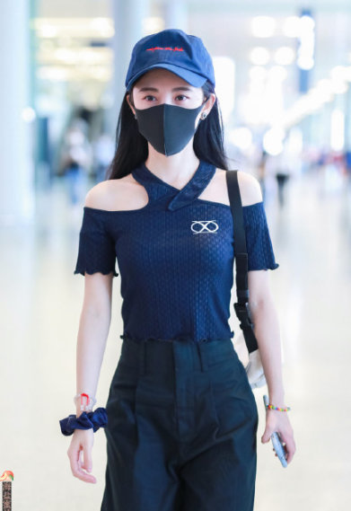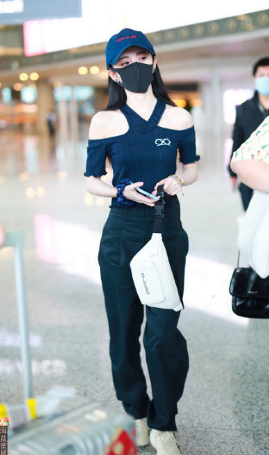 鞠婧祎SETUP-EXE黑色挂脖上衣搭配宽松休闲裤,脚踩一双老爹鞋,all black穿搭低调且甜美,少女穿搭模板了。