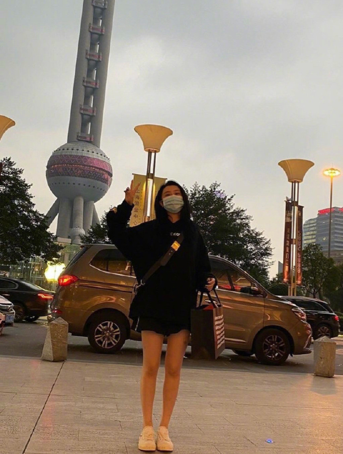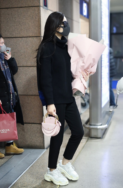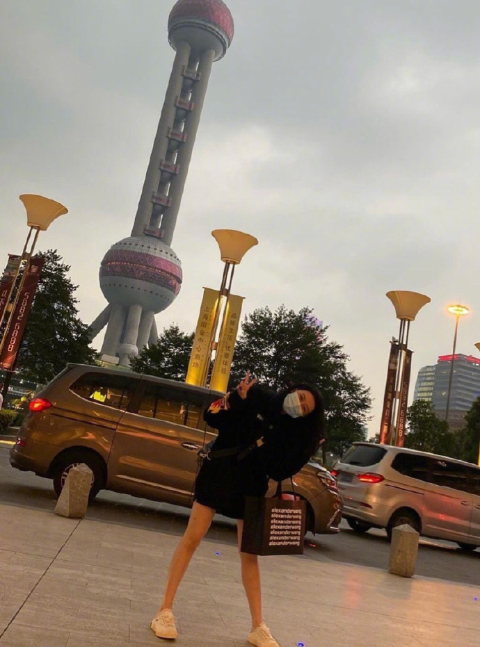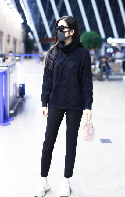 古力娜扎手拿DISSONA溜溜球系列粉色手拎包搭配极简all Black造型,整体酷劲十足,墨镜口罩加持,又瘦又美。