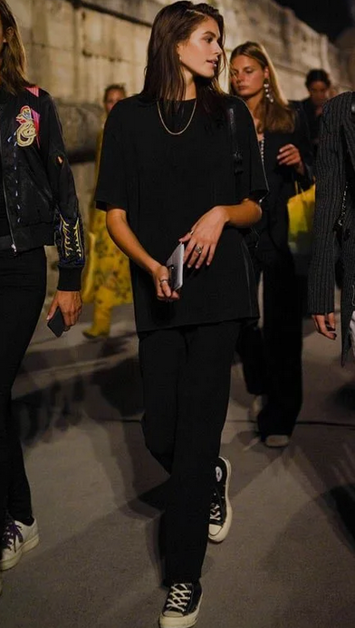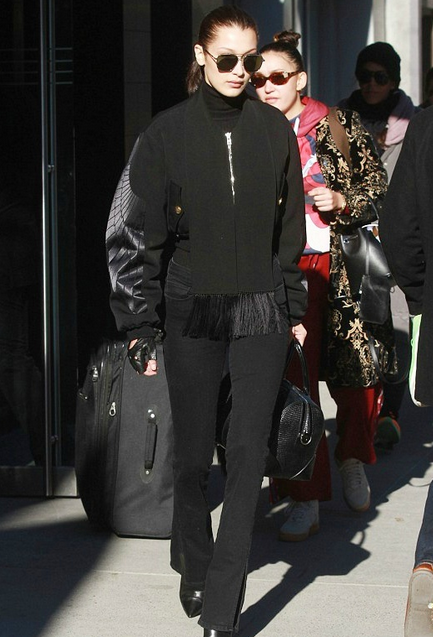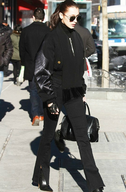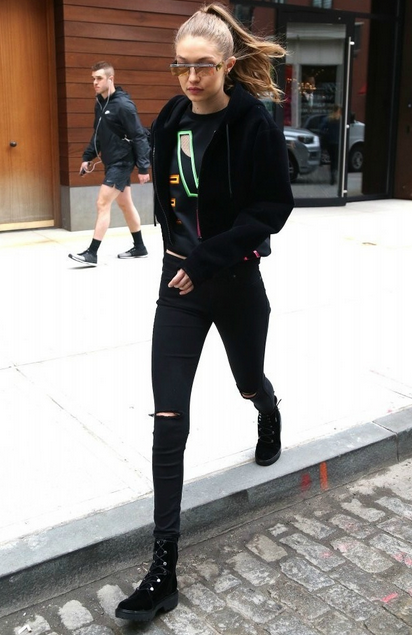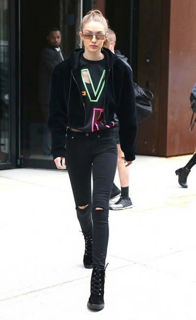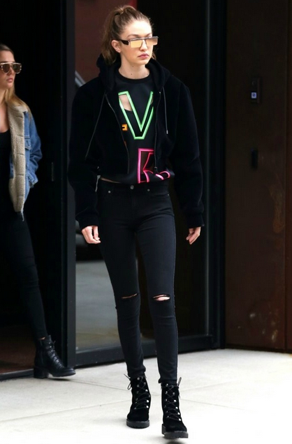 Gigi Hadid Versace的字母镂空卫衣搭配一身all black,再用金属色反光墨镜点缀,时髦度爆表。