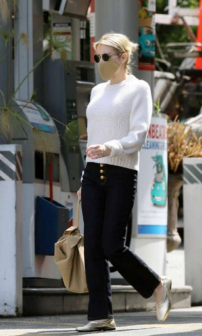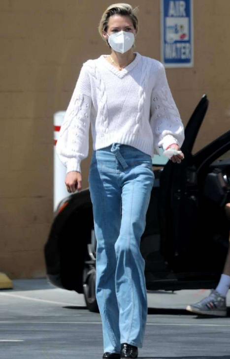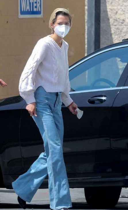 Jaime King身穿白色毛衣搭配牛仔喇叭裤出街,两个看似简单的单品都有很多小设计在里面,毛衣的泡泡袖、侧边开口,后背的“麻花”,还有裤子的腰带、后面的剪裁,这套穿搭real用心了,也是真的好看,利落大气!