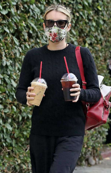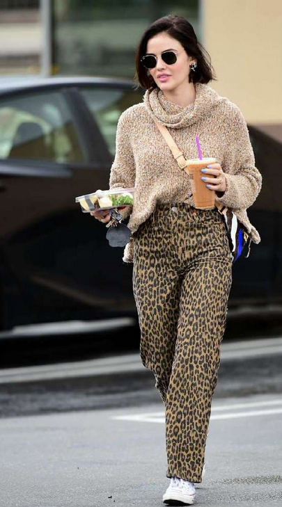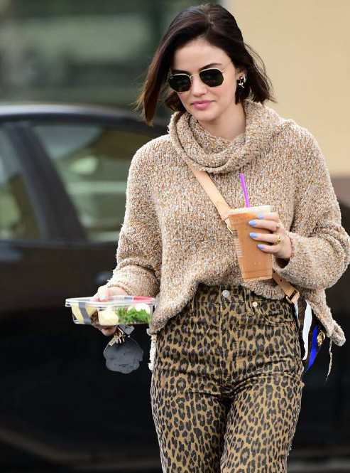Lucy Hale在洛杉矶外出买咖啡,棕色毛衣配豹纹长裤,飒!