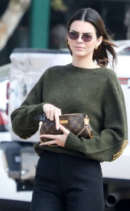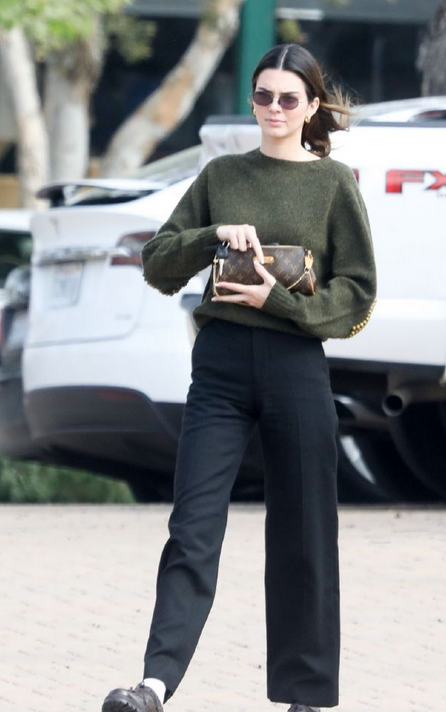 Kendall jenner 身穿墨绿色毛衣,搭配西装直筒裤复古小皮鞋,低调简约英伦风出街,但这一米八大长腿实在优越,想低调都难。