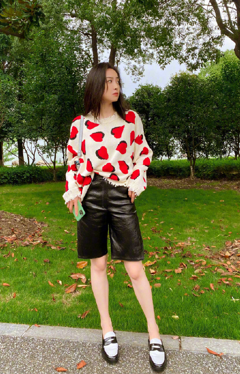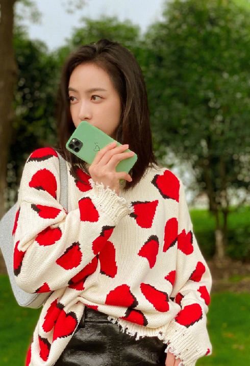 宋茜爱心印花针织毛衣搭配浅紫色法棍包,温暖甜美。