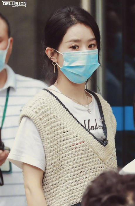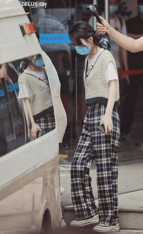 赵丽颖身着镂空针织毛衣背心,下搭藏蓝纽扣格纹长裤,浅色印花丝带轻束长发,优雅从容。