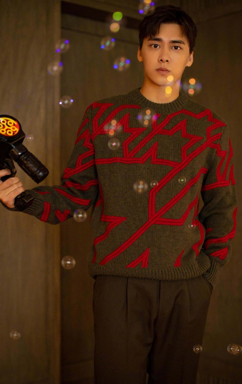 李易峰身穿拼色线条感毛衣搭配棕色西装裤,像一杯红酒,气质绝佳。