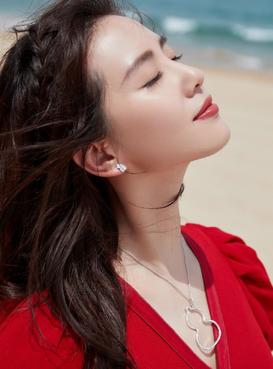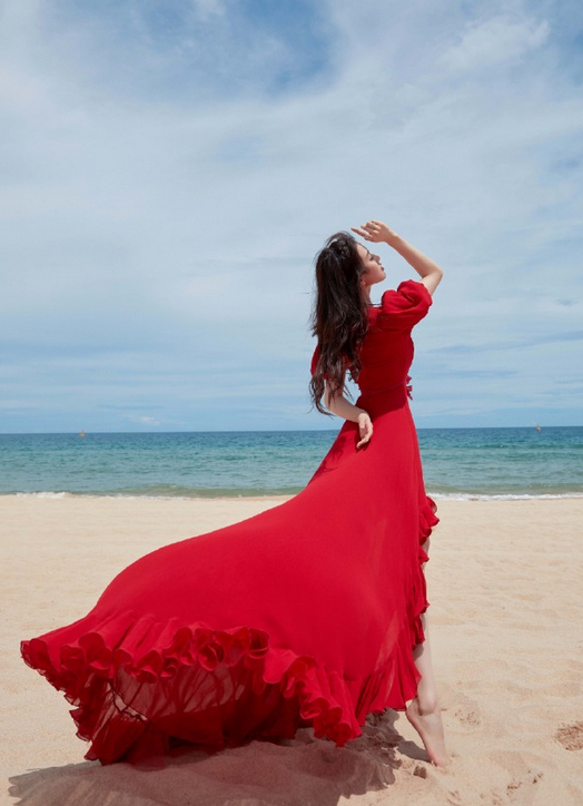 刘诗诗碧海蓝天红裙大片,身穿泡泡袖v领红色长裙,发丝随风拂动,举手投足间透出矜贵优雅感,蓝天之下海滩旁的一抹灵动身影。