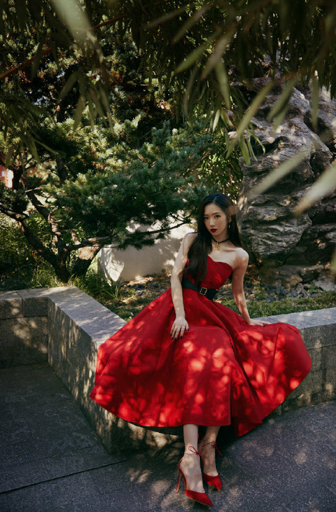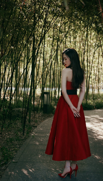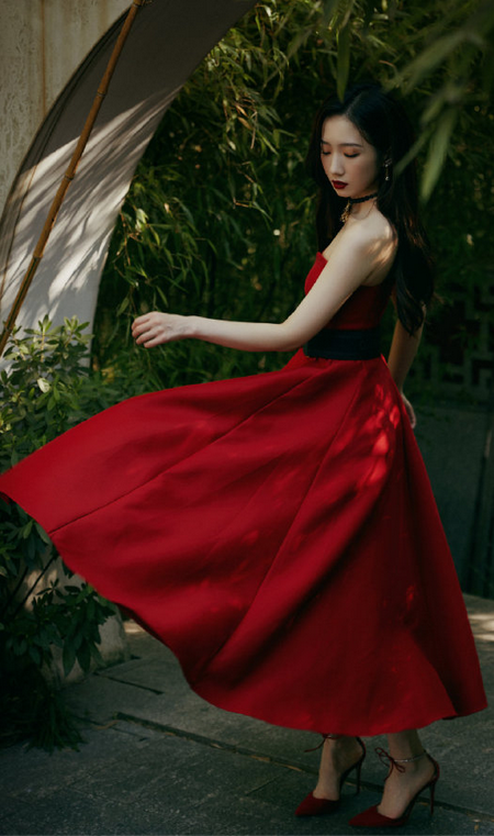 孟美岐身穿抹胸红色礼裙搭配细高跟鞋,展示优秀天鹅肩颈线条,颈间黑色choker点缀更显精致魅力,黑发红唇,于竹庭之中的朦胧美!