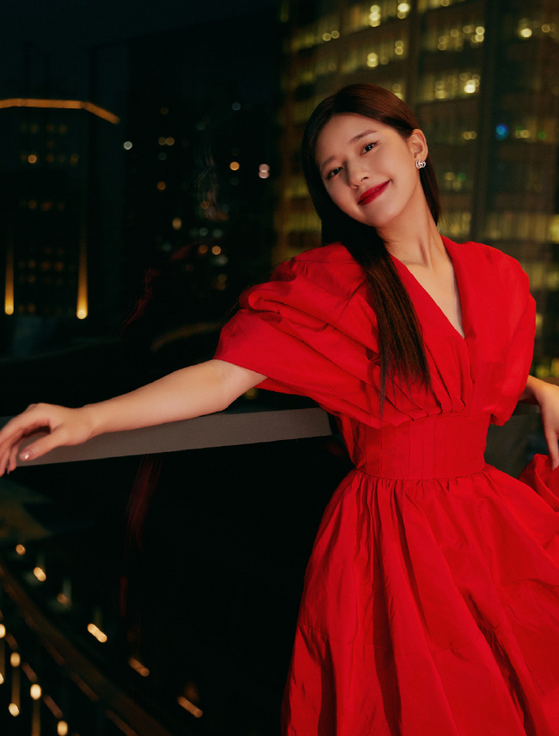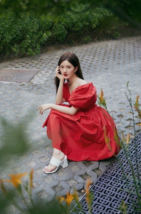 赵露思一身花苞红裙搭配白色厚跟鞋,笑容明媚,复古优雅。