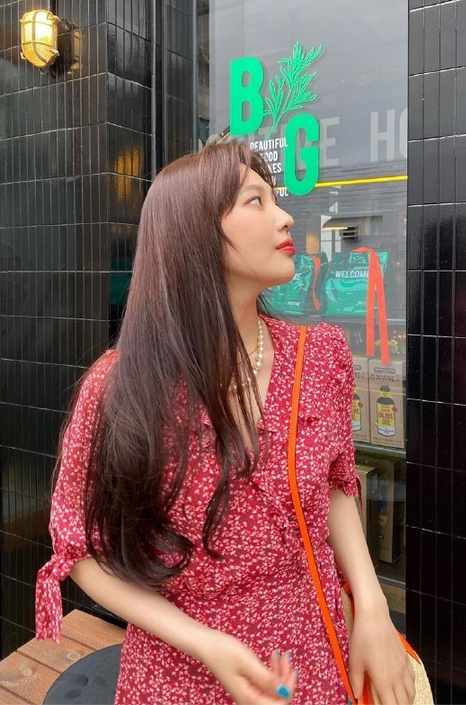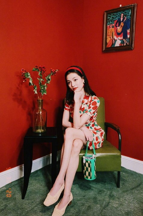 JOY身着红色碎花裙搭配田园编织包,踩上一双帆布鞋,新鲜踏青!