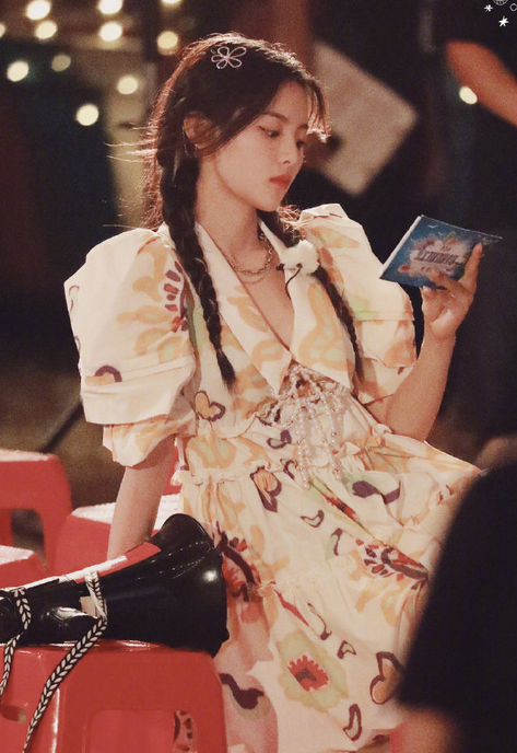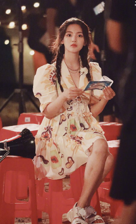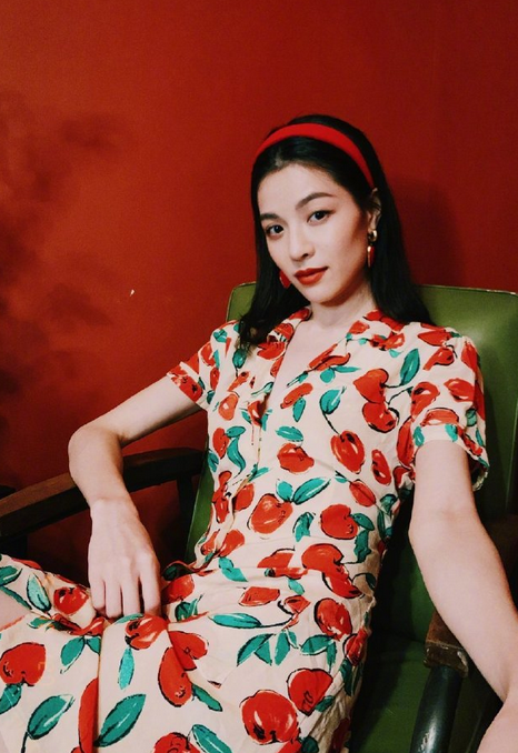 钟楚曦身着樱桃碎花裙,搭配同色系发带耳饰,复古又甜美~