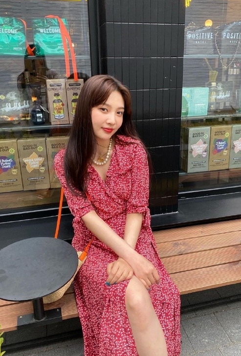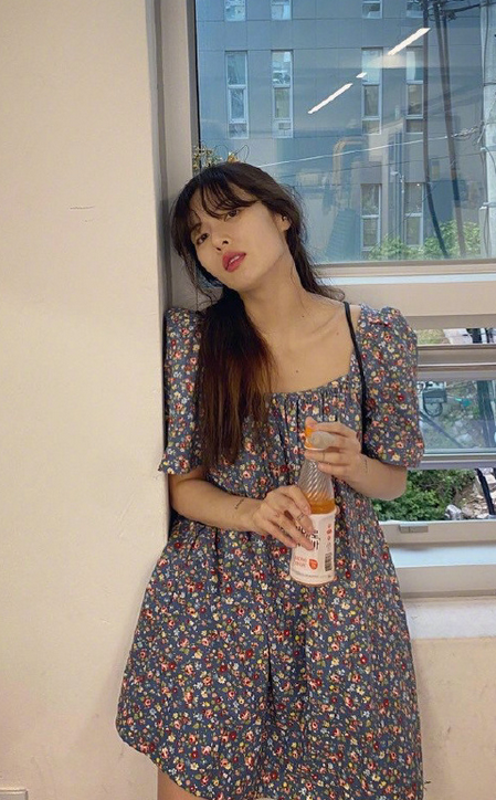 泫雅身着温柔碎花裙,搭配活力帆布鞋,朝气勃勃。