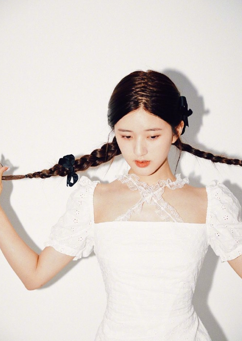 虞书欣身着白色泡泡袖连衣裙。