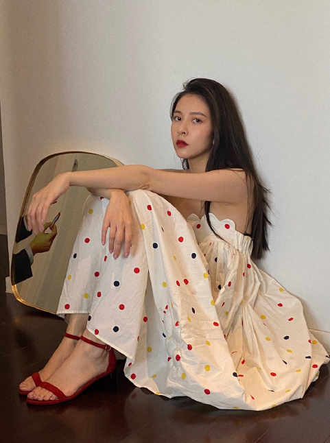 宋妍霏身着白色波点抹胸连衣裙,配上红色低跟鞋,色彩契合,优雅复古。