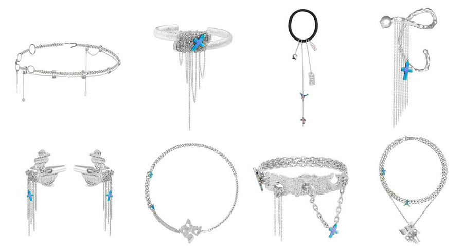 本系列产品主要突出工业街区文化,遍布的弹孔、破碎干瘪的易拉罐碎片、泛光的铁链— —无一不是青年野心的真实记录。幻彩色电镀装饰柔化冲突与破碎感,意味找到自我表达的新方式,比如街舞、比如时尚。