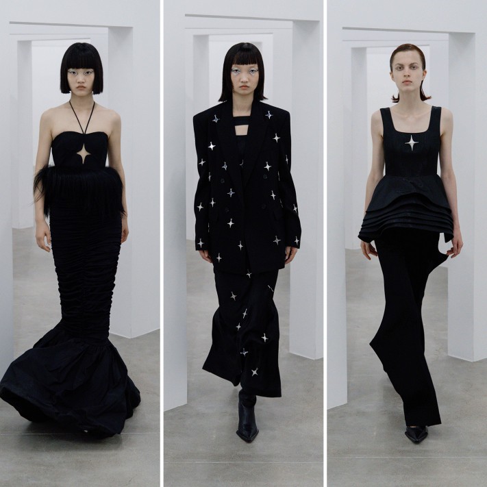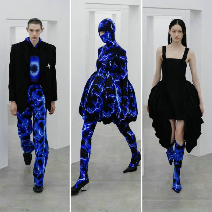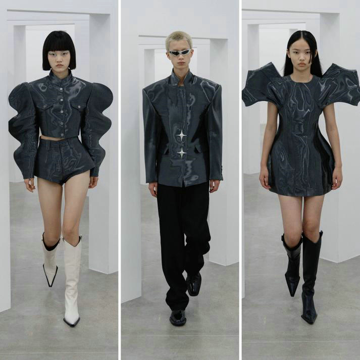 本季度延续了ANNAKIKI标志性的3D立体剪裁未来科技感廓形,艺术几何3D线条的袖子,以及对科技材质的尝试和面料的二次改造。通过对金属质感的光缎面料、金属五金配件的运用,构造出一个科技感十足的视感体验。发光材料、光纤织造等高科技材质的加入,在为感官赋予更深层次的精神内核,亦是一种对未来感的独到尝试。同时,光与影的运用,亮与暗的对比,无疑呼应了“类星体是宇宙中最明亮的光源之一”的特质。