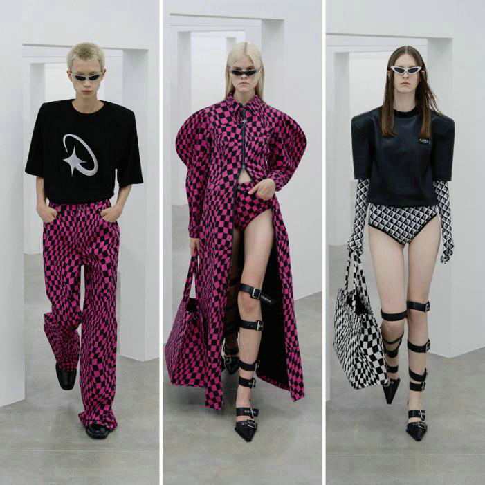 为了进一步打造科幻之感,本季在印花上进行了开发与创新,如科技X光、星光倒影、星际电光,都促成更为真切的视觉表达,象征着宇宙中复杂交错的力量。其中重点的3D变形几何印花和一体两面流星印花,都在视觉上形成“陷阱”,无论是错落有致还是不规则扭曲的黑白格纹,都令人想起物理学概念中的“时空的涟漪”。液态金属质感印花、3D金属流星、星球图案的点缀,无疑再次强调了宇宙与科幻,也悄然将这一宏大的主题具像化。反复出现的十字星形,直白地强调了系列所探讨的主题,该意向的累加运用,也无形中成为“线索”,将各色时装串联而起。