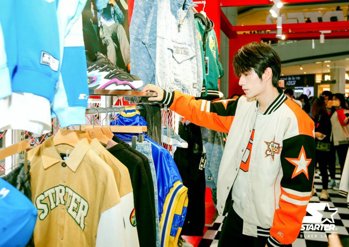活动当日,STARTER品牌大使张颜齐身着STARTER BLACK LABEL 2021秋冬YOUNG BLOOD 主题系列新品空降恒隆广场,并以STARTER一日店长的身份与消费者近距离互动,和大家一起在这沉浸式空间中零距离感受美式复古印记和品牌历史的传承,将现场的氛围引致高潮。活动现场,STARTER CEO Keith Cheng更是惊喜现身,于舞台之上为品牌大使张颜齐送上一款独家定制的外套,作为此次活动的品牌礼物。