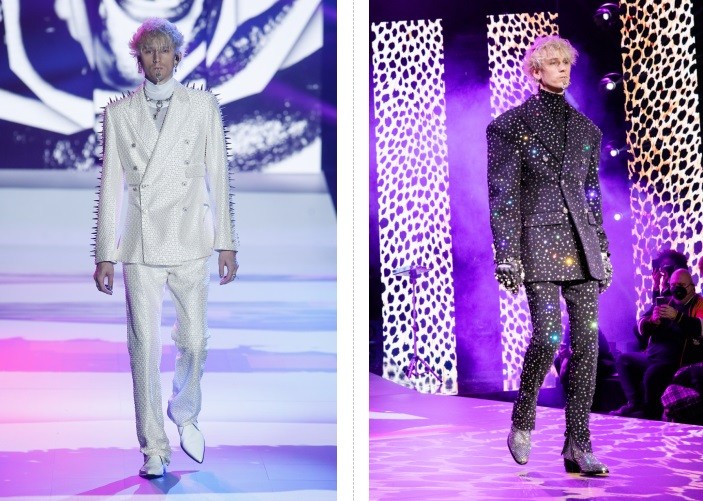 Machine Gun Kelly身着一套镶有珍珠配以铆钉装饰的双排扣定制西装作为开幕。在终场时他身着一件22-23秋冬镶有珠宝的双排扣西装成衣,并搭配高领毛衣。