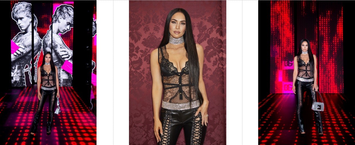 Megan Fox身着带有DG logo纽扣的蕾丝紧身胸衣,配以有系带的低腰皮革长裤以及与之配套的水晶镶嵌腰带和项链、水晶刺绣手袋和黑色高跟鞋。