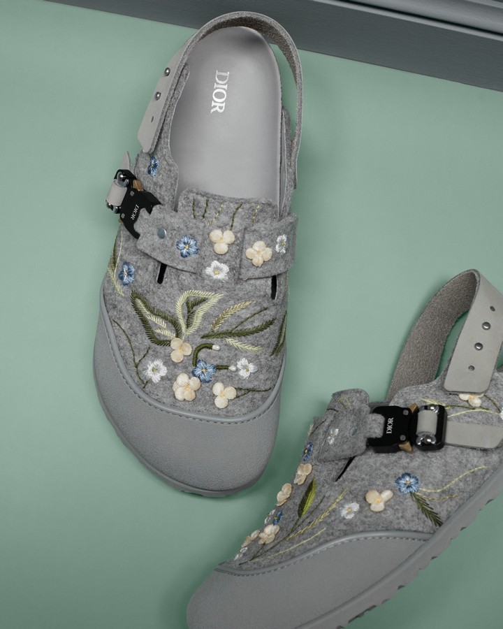 Birkenstock 的 Tokio 穆勒鞋和 Milano 凉鞋采用了符合人体工程学的软木乳胶鞋床,鞋面分别是毛毡和绒面革设计,鞋子配色包括当季流行色和 Dior 经典灰色。