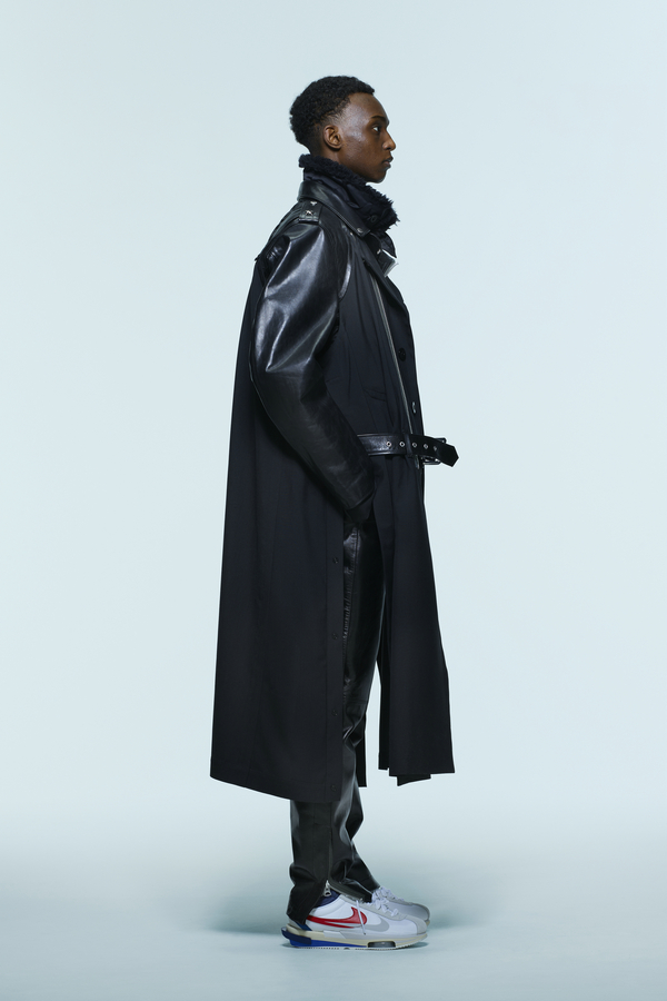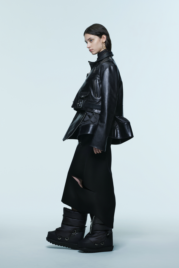 本系列引入全新合作——与制造 Perfecto 机车夹克的大师级品牌 Schott。 sacai 风格在保留原有廓形的基础上,为女性添加了宽大的荷叶边衬里或拼接超短的羽绒服,为男士调成可拆卸衬里的比例或混搭与礼服外套。