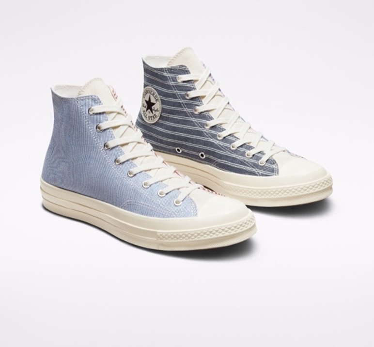 由英国老牌古着店铺 Beyond Retro 采购并精心挑选出的古着衬衫,经由 Converse 的审美视角进行升级改造。这些回收衣物经过清洁、分类、剪裁、混合与缝制等一系列程序后,将衬衫上原本的条纹图案布料最终构成独特的Tri-panel 鞋面,呈现出清新舒爽的夏日面貌。两双鞋款上的细节与这些回收服饰本身一样别致,同时每一件作品都独特。废弃旧衣,新生再造,物尽其用,变废为宝。