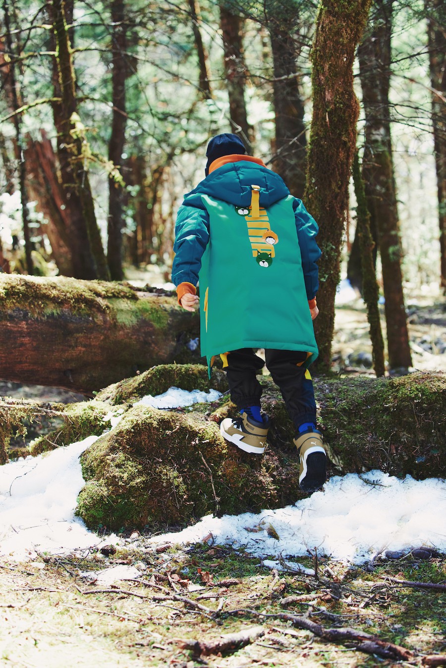 男孩身穿深绿色羽绒外套,背后多彩动物印花点缀在LOGO之间,尽显纯真无邪之感;内搭咖啡色印花针织卫衣,温暖舒适,犹如身处森林的怀抱。黑色梭织长裤拼接两侧串花设计,搭配黑绿白撞色REBOUND鞋款,多色单品活力无穷,为凛凛冬日增添暖意,让玩家们所及之处色彩纷呈,温暖不断。