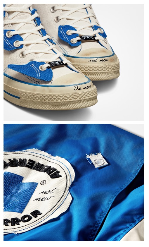 鞋款整体以怀旧复古风格为灵感,经典Chuck 70经过独特的分层堆叠处理,呈现出全新别致外观。麂皮面料的运用,致敬初代Chuck鞋款标志性外观;同时加入可拆卸覆面以及刻意做旧的鞋边胶条,胶条上亦叠加刺绣ADER ERROR品牌标语”The new is not new”;定制后跟标点缀双方品牌标志性logo,麂皮鞋舌饰有不同纹样的定制联名品牌标识。除此之外,该鞋款还增添了许多独特设计亮点,定制鞋带扣和可见ADER ERROR标志图形的半透明大底的运用,诚意十足。