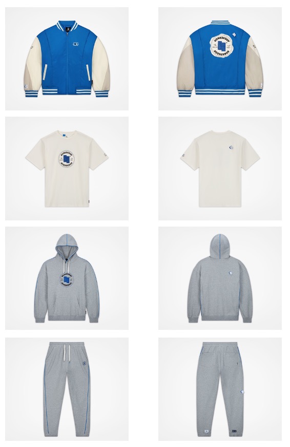 棒球外套在配色上运用了ADER ERROR的标志蓝和基础纯白色。衣身采用起绒毛圈面料,与袖子和两侧的斜纹织物滚边形成鲜明对比,右肩后方的联名织标和后背中下方的同色Converse刺绣字样,为整体造型加入巧思细节。同时肩部褶皱设计使上身活动更加方便,别致设计亦能满足日常穿搭需求。