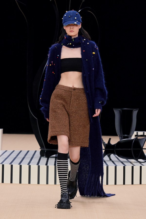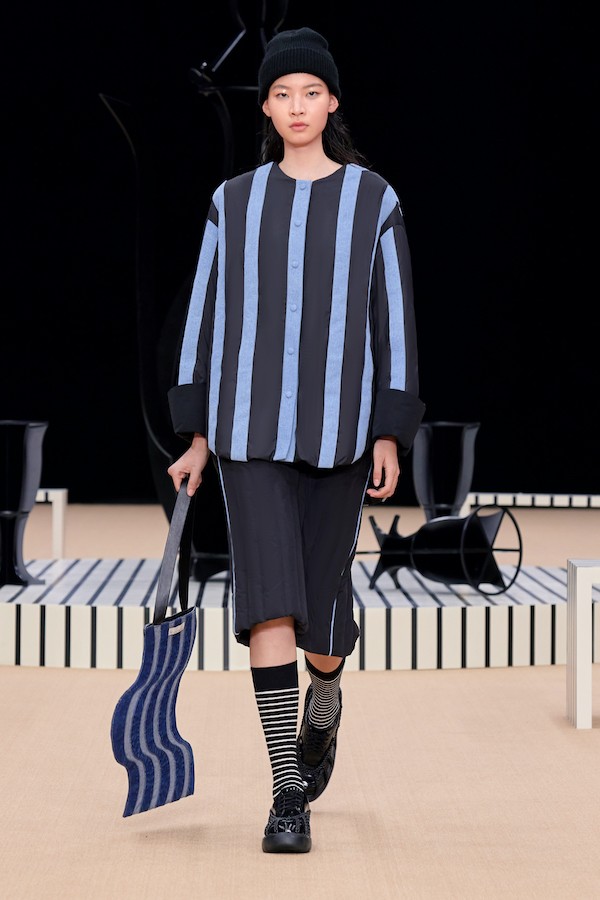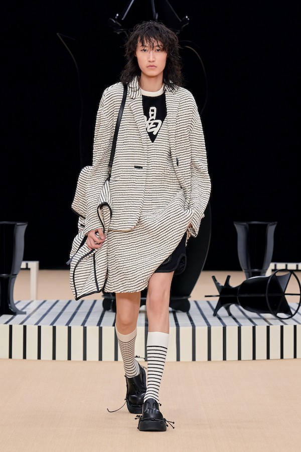 删繁就简的东方元素一如既往贯彻在夹生:HALF MADE的设计血脉中,在这次秀场上,我们不仅可以看到手工结扣这一经典元素,还有对于传统酒器的再重塑,酒瓶和酒囊作为道具和图案反复出现,极具设计趣味性和张力。