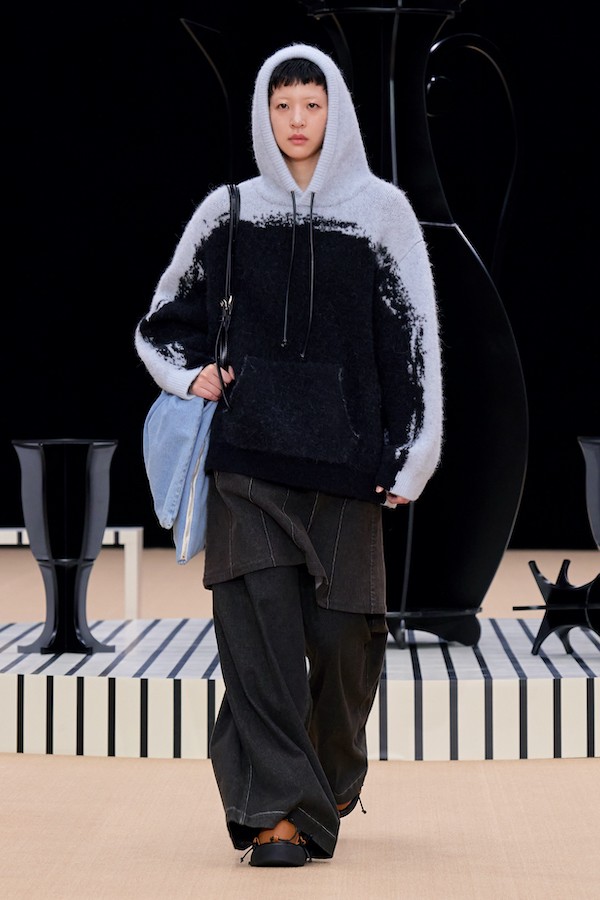 秀场的舞台设计也延续了2023春夏系列的经典黑白色调,外圈的圆环像是一圈座椅,而中间的圆盘上放置着酒瓶和或倒或立的酒杯,让人仿佛沉浸到一场喝至尽兴的友人酒局氛围中。