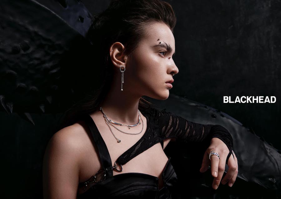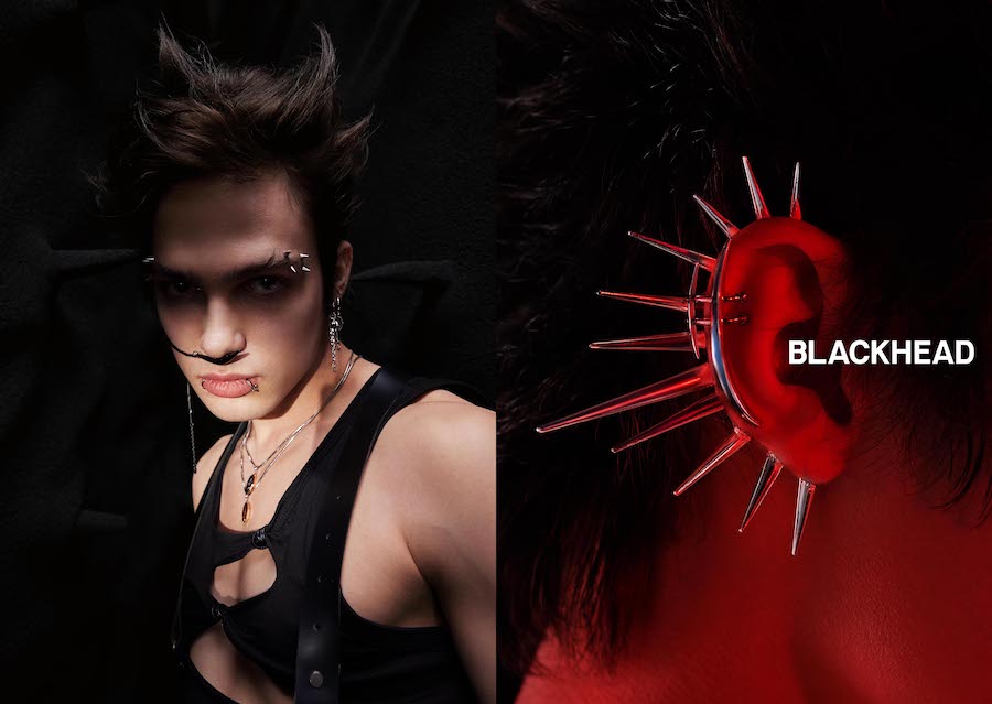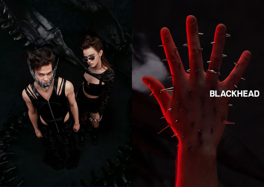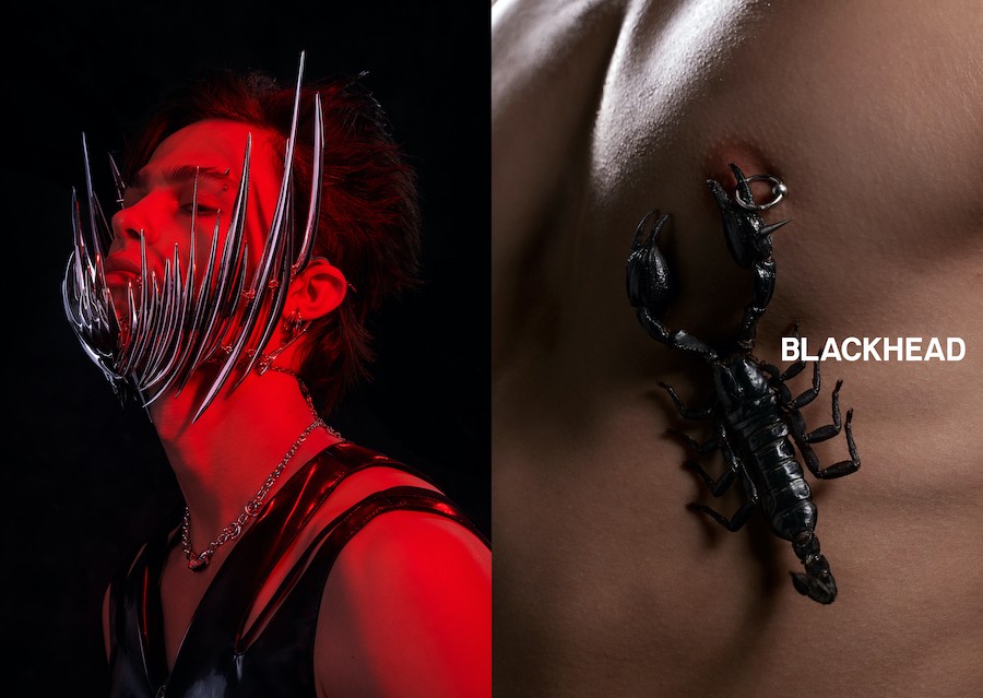 BLACKHEAD发布2023 S/S APOCALYPSE天启系列,该系列以象征致命危险后获得新生的蝎尾,由内向外刺入的装饰异物,尖锐生物状形态与八边镜组合。捕捉蝎尾青年的敏感及抗争性,把反叛精神、分崩离析的威胁元素和未知幻象各归其所。