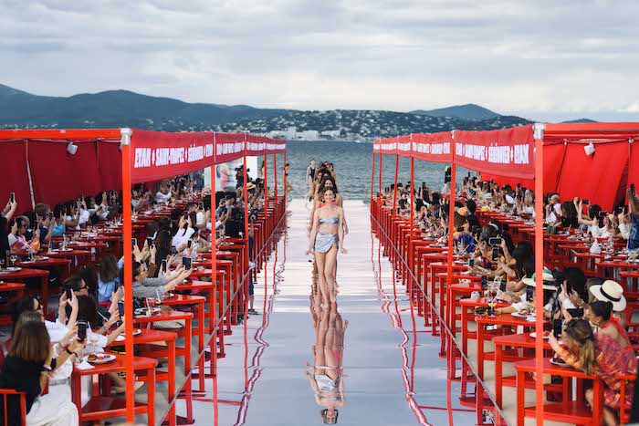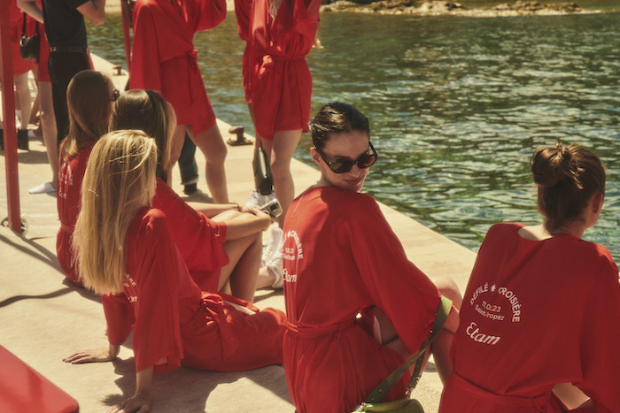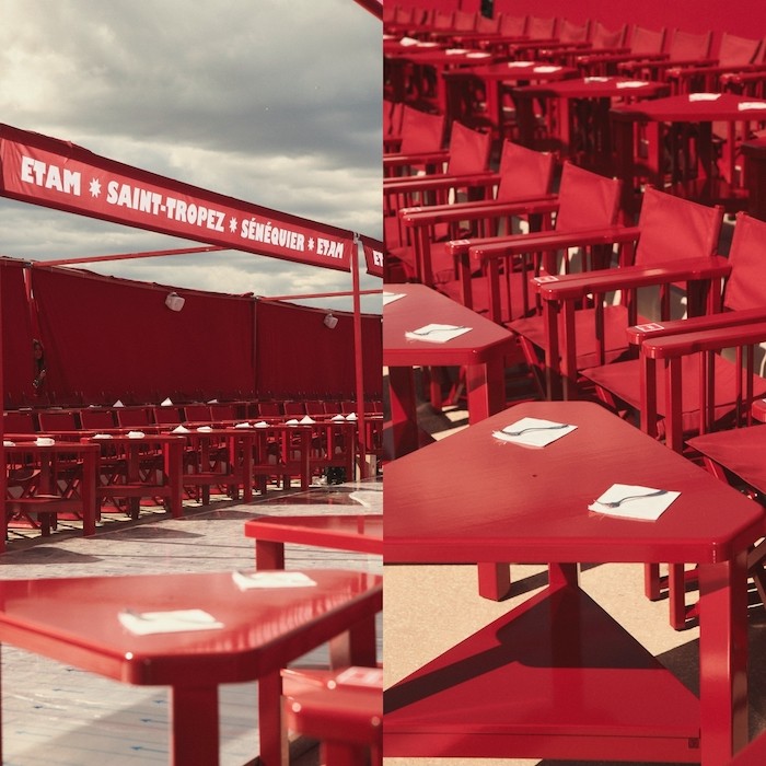 浓浓度假氛围的Café Sénéquier红色桌椅组成了Etam的秀场看台,就如果汁、甜品是假日标配一样,时尚大秀仿佛也可以成为“Menu”上的一道选项,观秀宾客们只需要轻松惬意的去享受这场海滨宴会即可。