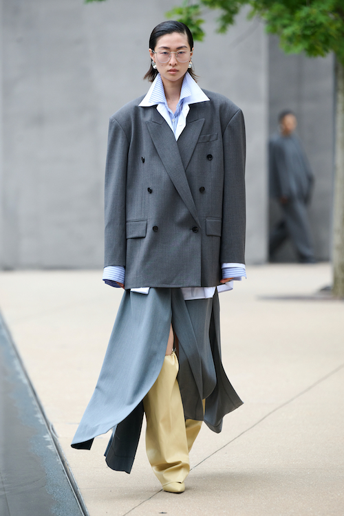 在配色上,更注重颜色的质感,以灰色为基底,加入灰蓝、灰绿和米黄等柔和的色彩,在轻松的氛围中融入些许模糊的神秘感。丰富的色彩应用于不同的材质上,使得穿着者能够轻松演绎当下的“片刻”。同时,还增加了秋冬黑色组合的趣味性,使整个系列更加丰富多样。