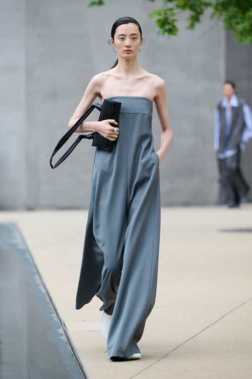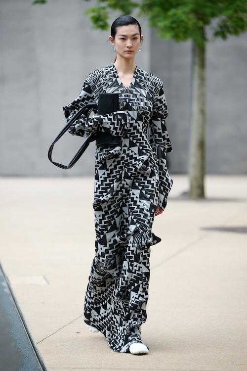 在水镜舞台的艺术加持下, 国际超模汪曲攸、华依澜领衔一众模特,演绎JNBY 2023 秋冬新款,充分展示了本季产品材质、廓形与肌理变化的背后所描摹出的女性形象。与此同时,台下观秀的明星薛凯琪、李斯丹妮以及刘令姿身穿JNBY 2023 秋冬新品,给本季主题带来不同的视觉解读。