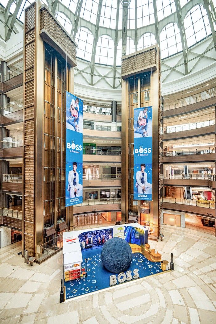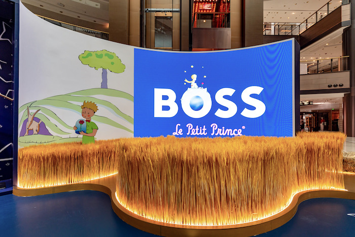 醒目的BOSS品牌标识坐落于限时店入口,巨型的蓝色星球屹立在此身后,仿佛小王子的星球B-612,带领宾客探寻梦幻旖旎的童话世界。玫瑰花店、金黄的麦田环绕四周,与其展示的联名系列作品相得益彰。整个空间还设置了多个AR互动机制,为消费者打造多方位的沉浸式体验。