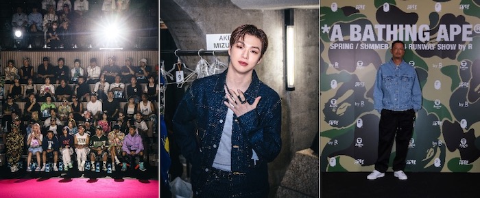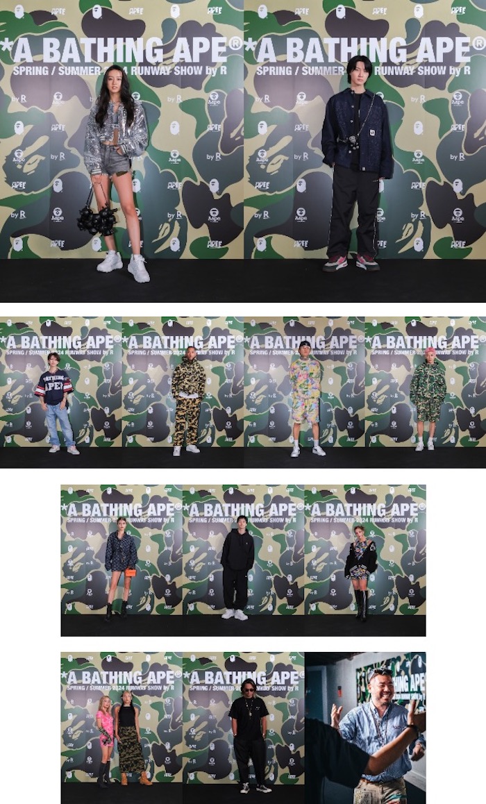 在这场BAPE®回归东京发源地举办的首个时装大秀,众多来自日本时装界与潮流圈最具影响力的全明星豪华阵容受邀坐镇秀席,包括时装主理人细川雄太、尾花大辅、本间正章、宮崎泰成、熊谷隆志;新生代模特KŌKI木村光希;演艺圈明星樱田通、岩桥玄树、池内博之等重量级嘉宾。韩国人气歌手姜丹尼尔(DANIEL KANG)担任此次春夏时装走秀模特。除了璀璨群星云集助阵,此次「2024春夏时装秀by R」同步发起了全球直播,令世界各地的BAPE®品牌支持者第一时间入席东京秀场,共同见证精彩绝伦的春夏时装盛宴。