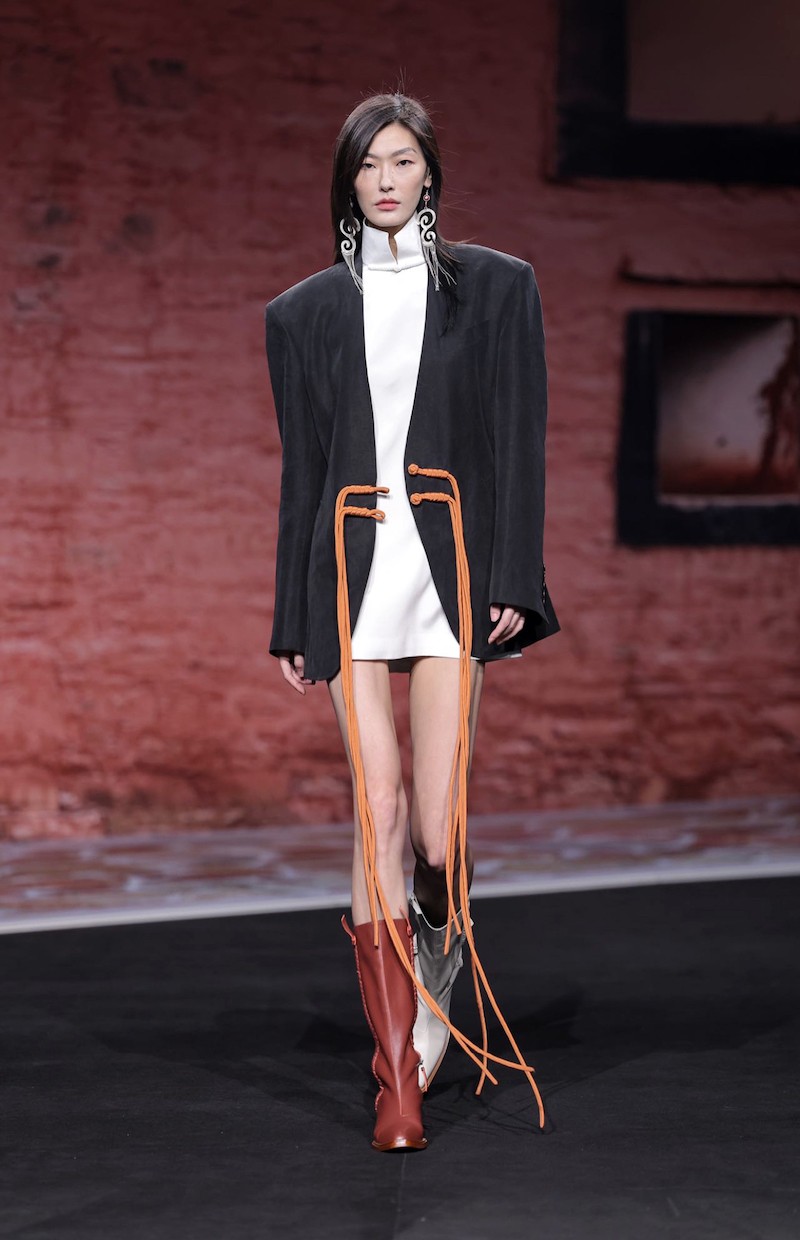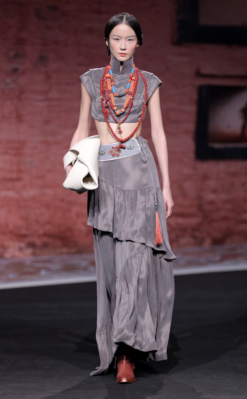 本季,素白依然以时尚的廓形呈现简练的西装、不对称的露肩长裙、飘逸的裙摆和干练的马甲,以不拘无束的造型为时装的基础发展托底,再以藏族风趣的花型、立领、盘口、流苏、拼接、叠搭作为点睛聚焦,我们也可以看到拟生花瓣的领口和袖口,时尚与民族共生的设计巧思,立体藏式的腰带,激起观众视觉兴趣又以中性的规格游离于时装之内。以藏区风貌着色,但以休闲款式落地的风衣、外套也是本季的设计亮点,这得益于以互联网为大本营的马乖,从更网络流行化的触角去满足当代消费者多变、复合、多场景流动的穿衣需求。