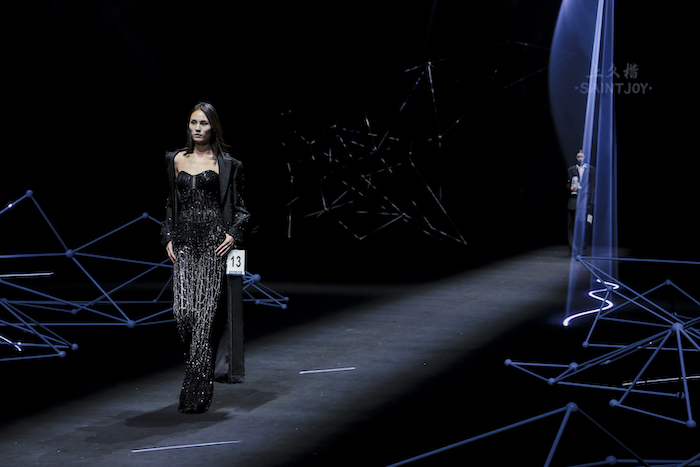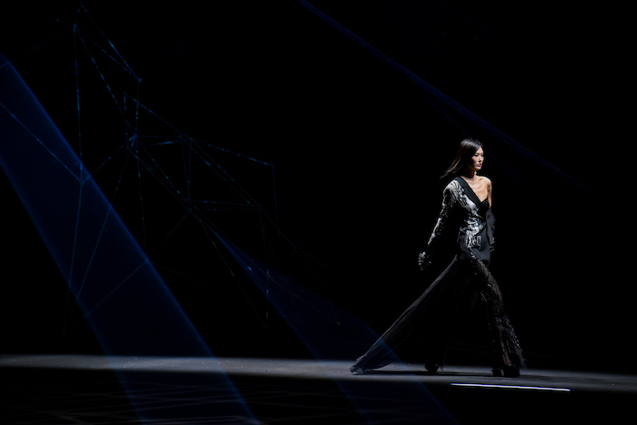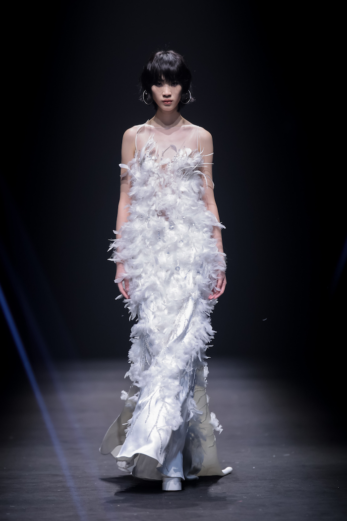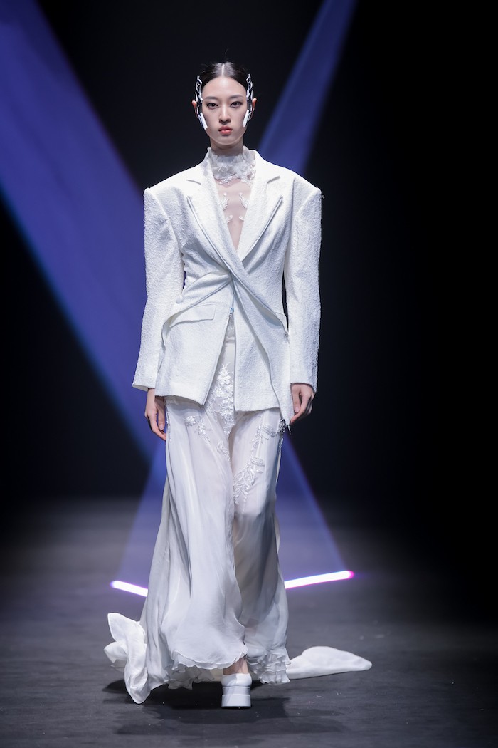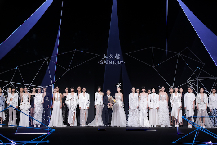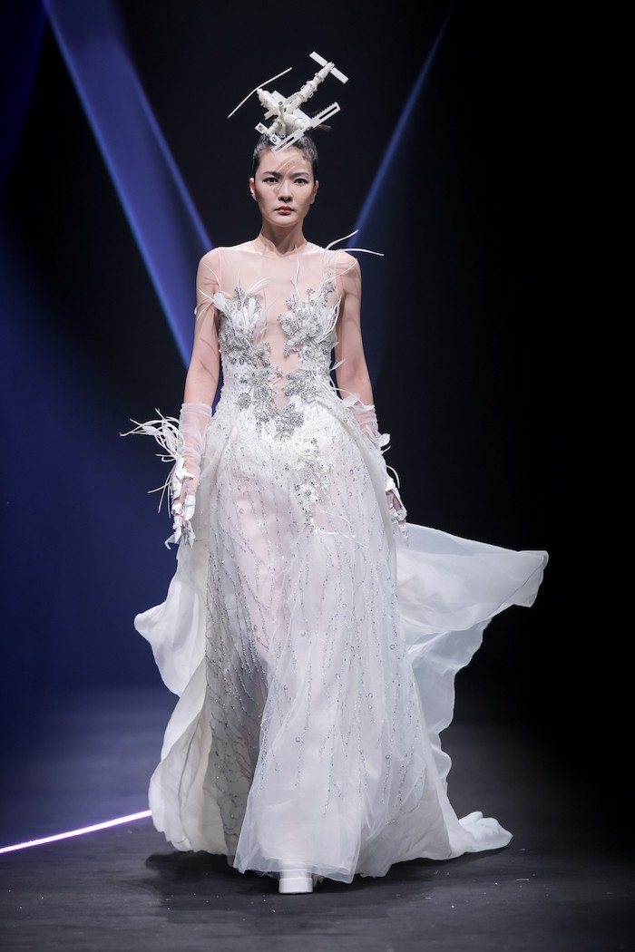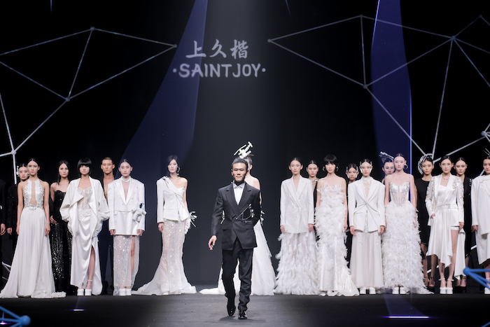 基于《庄子》“鲲鹏展翅”的神话寓言故事,上久楷利用“北冥有鱼”、“鲲鹏之变”和“大鹏展翅”巧妙寓意非遗创新的三个重要阶段,将本次大秀设置为“成鲲”、“化鹏”及“星槎”三个系列。以宏大的视角、虚实的元素,创造出一个“山海经”般的超现实奇幻世界。秀场上,三个系列通过去繁从简的黑白灰色调、流光溢彩的金丝银线及刚柔并济的经典轮廓,致敬着“鲲与鹏”游弋水中、遨游苍穹的自由惬意,及突破命运、寻求极致的哲学旨意。