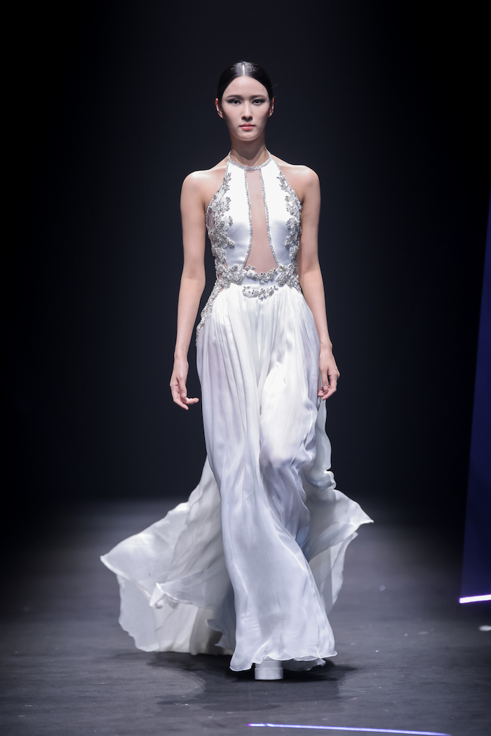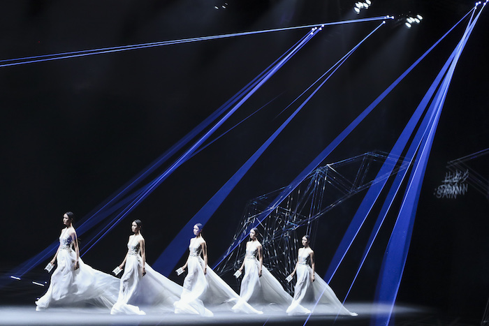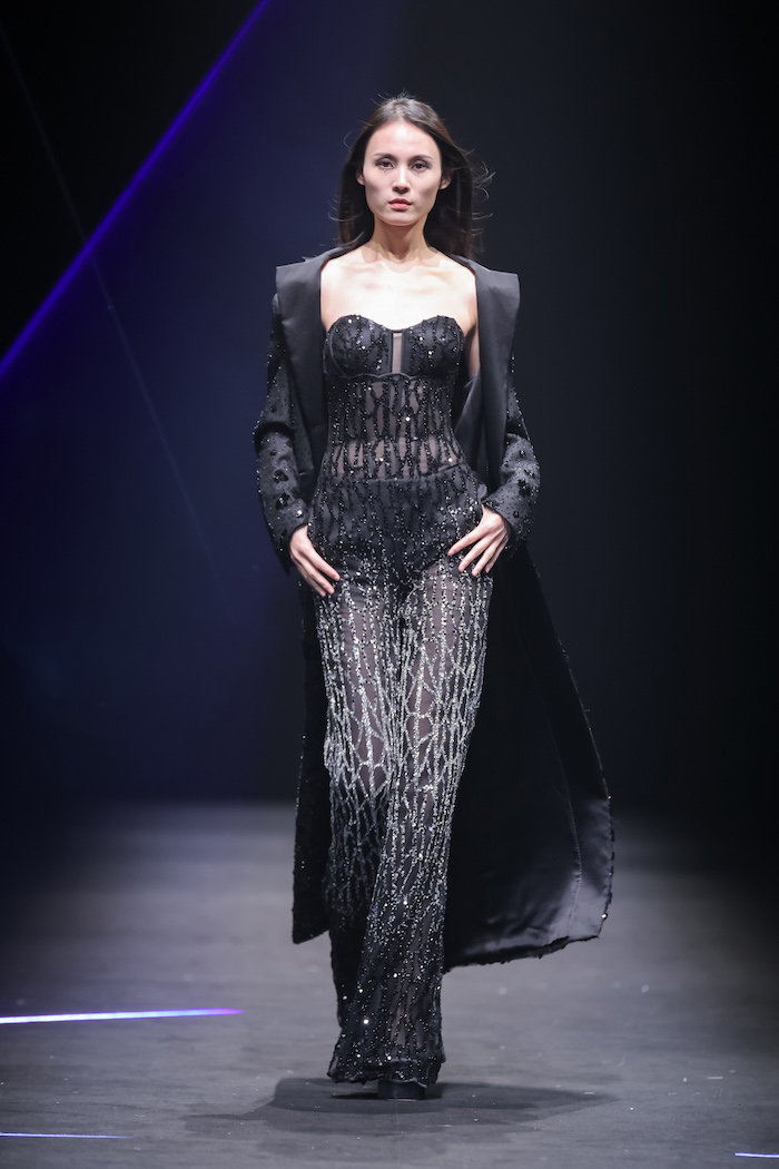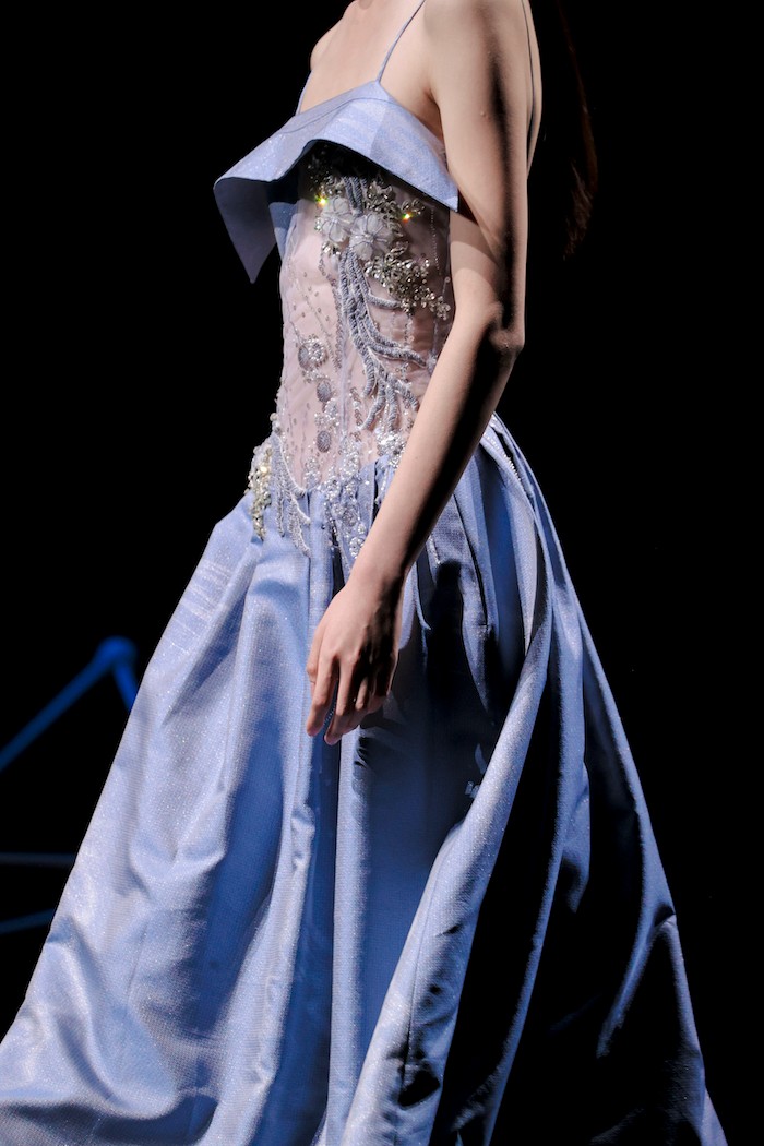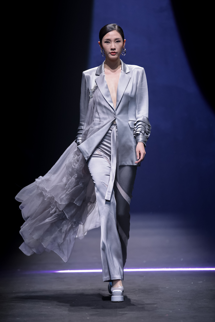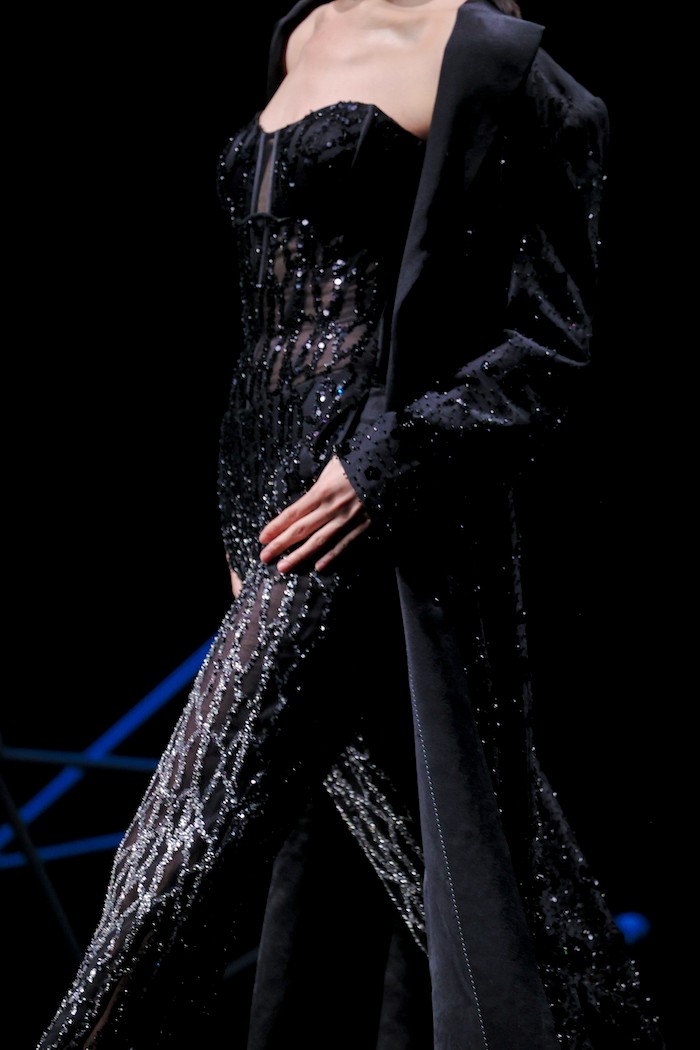 基于《庄子》“鲲鹏展翅”的神话寓言故事,上久楷利用“北冥有鱼”、“鲲鹏之变”和“大鹏展翅”巧妙寓意非遗创新的三个重要阶段,将本次大秀设置为“成鲲”、“化鹏”及“星槎”三个系列。以宏大的视角、虚实的元素,创造出一个“山海经”般的超现实奇幻世界。秀场上,三个系列通过去繁从简的黑白灰色调、流光溢彩的金丝银线及刚柔并济的经典轮廓,致敬着“鲲与鹏”游弋水中、遨游苍穹的自由惬意,及突破命运、寻求极致的哲学旨意。