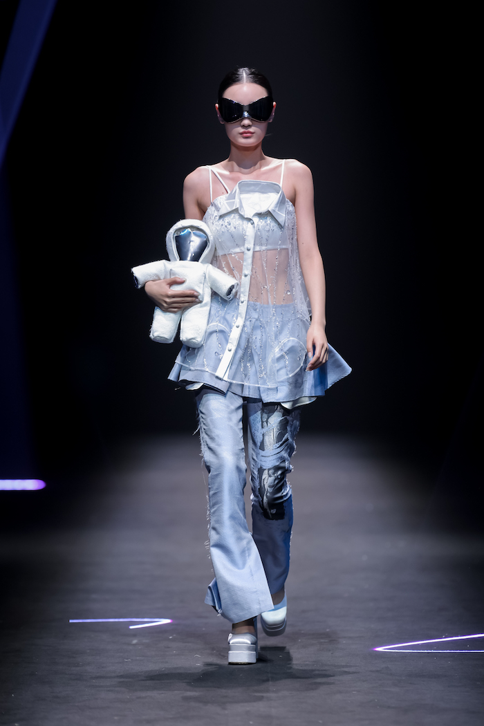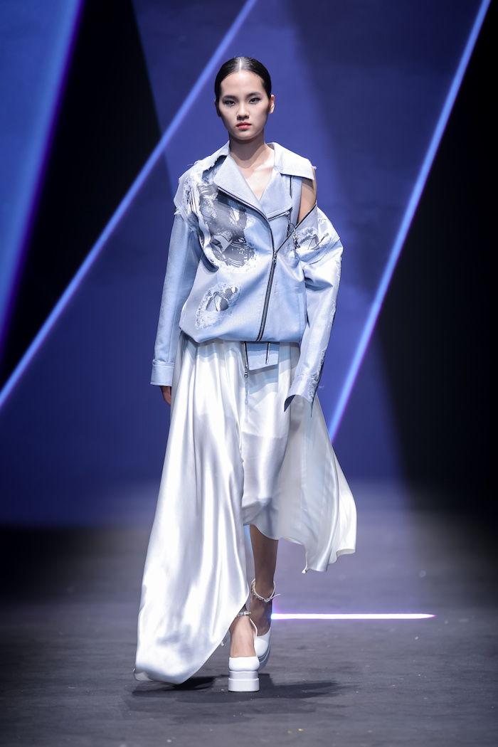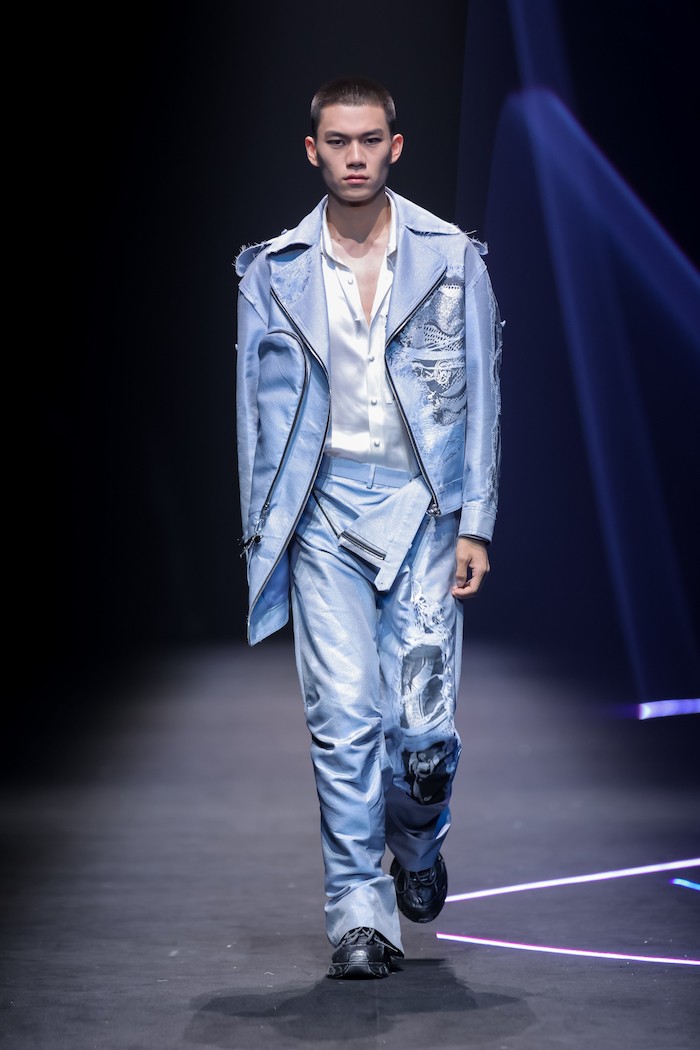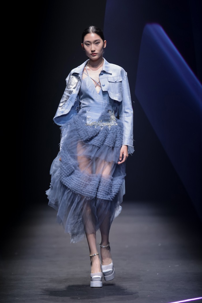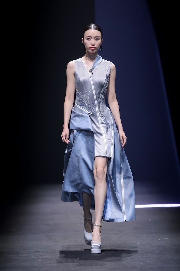 此次推出的春夏系列发布会中,模特身着带有机械腿结构的微喇牛仔裤从容出场,彰显当代女性独有的冷静、从容的大女人魅力。这10件牛仔单品均由弹力宋锦面料制作而成,上久楷将取自天然蚕坊的顶级真丝与粗犷耐磨的牛仔质感结合,在降低牛仔摩擦系数同时保留了肌理质感,让牛仔质地爽滑“会呼吸”,呈现时髦又前卫的街头风格,实现了“生活与非遗的最终结合”。另外,延续上一季“一衣多穿”的理念,本季作品仍有强烈的可持续时尚色彩。设计师将拉链设定成为服装中的主角,利用其线条感对服装进行解构、重构,组合出多重穿搭形态。