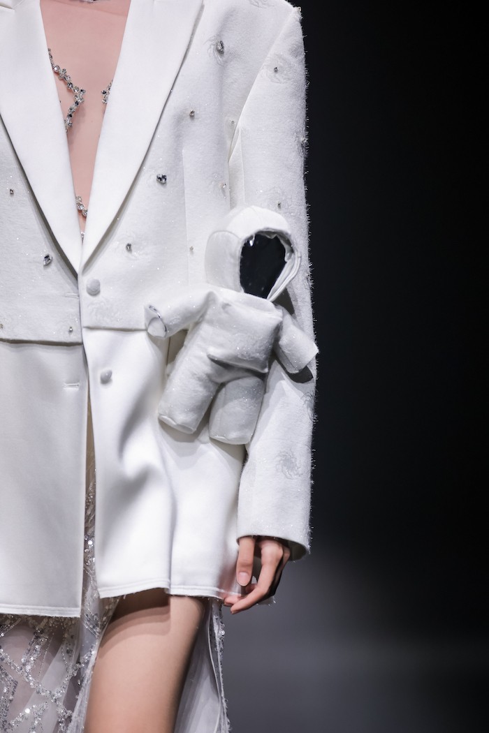 在边惠中看来,鲲与鹏所涉足之地是神秘的地底深渊,是无垠的宇宙星海,是沉睡的远古遗迹,亦是展望的未知未来。因此,第三个系列“星槎”则与未来科技相连接,通过羽绒材质与宋锦面料的混搭,重新定义非遗的创新边界。压轴造型更映射天宫一号的成功发射,将勇往直前的氛围感拉满,让宋锦成为连接幻想与现实,过去与未来的桥梁。