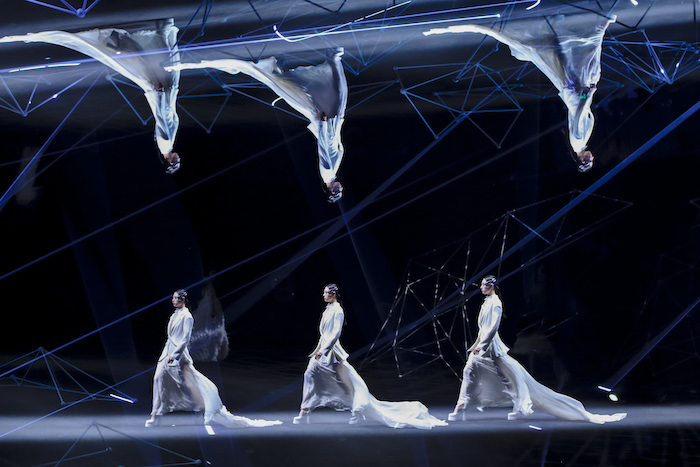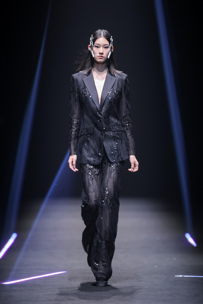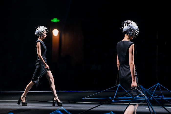 纹样上,本季借助于有“宇宙魔方”之称的「河图洛书」中的阴阳波点、翻转八角,并结合宋锦的排列方式,呈现别具一格的波点、格纹图案,并与结构上的黄金分割契合,延伸出无数种变化的美感。同时,现代机械感的图案、结构与材料,与传统宋锦相互编织、碰撞、交融,塑造出更富未来感的赛博朋克风貌。另外,头饰也结合3D打印技术建模,在视觉上重现科学与艺术,理性与感性之间的较量,让未来主义色彩更鲜亮。