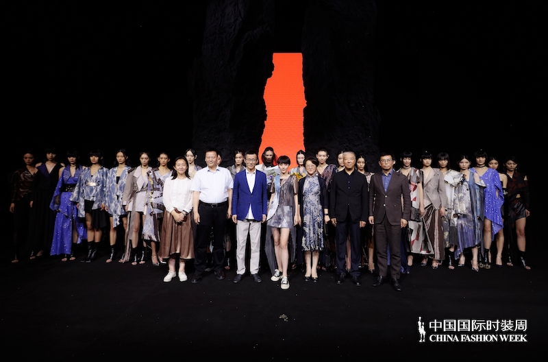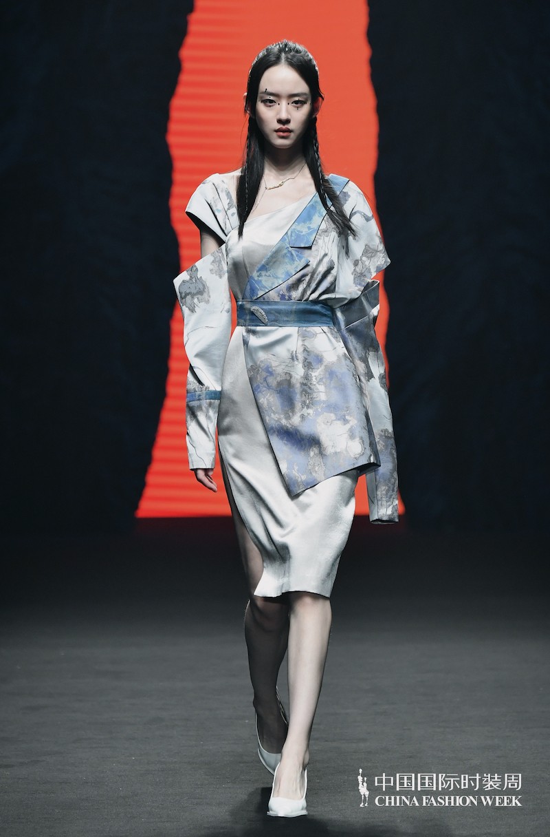 除了宋锦外,棉麻质感的肌理印花面料清新而雅致,搭配环保蛇皮腰封及金属水波纹面料,混搭感与实穿性并存。硬朗线条与立体廓形外套中渗透着北宋徽宗钟爱的汝瓷天青色,精细烫金绘出的写意山峦宛若宋瓷“裂纹生花”,极具破碎与自然之美。同样面料做成的提花外套采用了特别的剪裁:消失的结构线——西装领子向下延伸与成衣融为一体,通过建筑解构的裁剪形式融合了东方审美和现代廓形,解构主义的运用与中式水墨印花的结合营造出“虚实结合”的东方之美,隐喻了设计师对即将失传的非遗宋锦所代表的一系列文化消失现象的惋惜与意欲保护的心情。