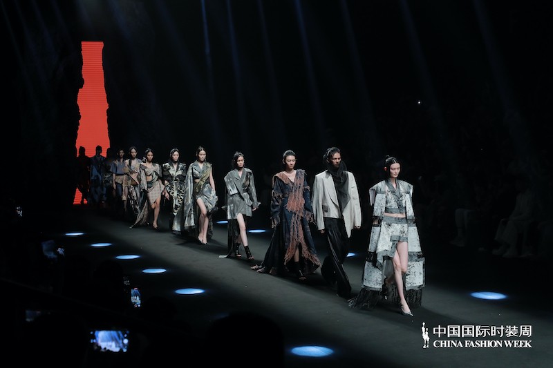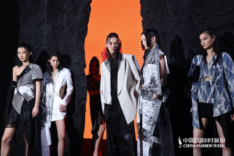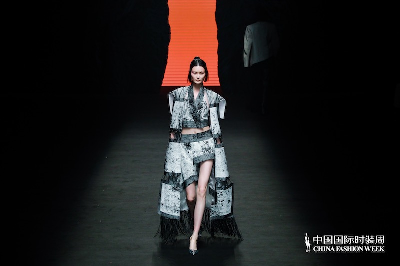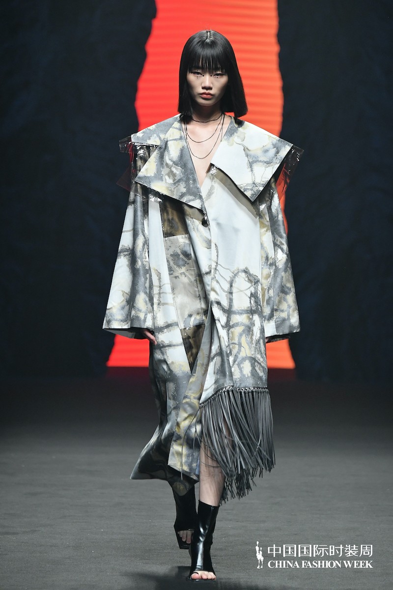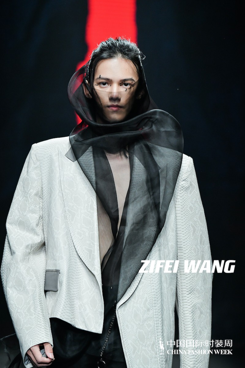 第三个系列结合了第一个系列的不羁洒脱与第二个系列的大气优雅,形成了非常具有品牌特色的宏大秀场叙事。几何针织提花与金属枪色纱巧妙碰撞出硬朗的中性气质;暗红扎染撕毛牛仔的宽大兜帽外套幽深而阴郁,颓废而不羁;改良对襟褙子上衣打破常规宋制褙子的固有结构,与黑白抽象泼墨肌理面料的融合再现 ZIFEI WANG 一贯续以中式高古与国际语境的对话方式;醍醐灌顶般的不羁之上压着一层透视黑纱,暗喻南宋时期禅宗画技与院画派“控制”技法的融合。