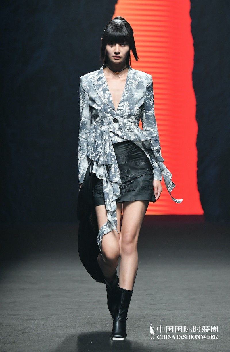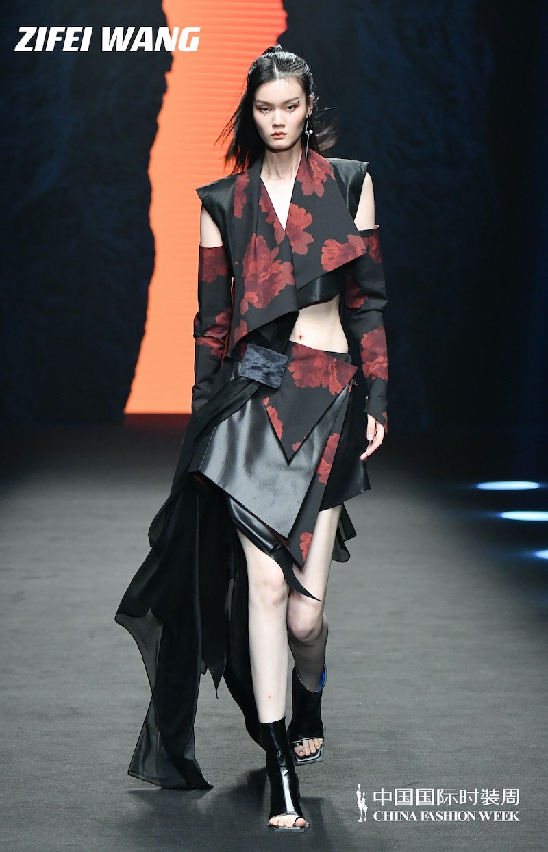 率先出场的是ZIFEI WANG红黑系列单品,黑暗中盛放的红花在金属纱的衬托下若隐若现,仿若燃烧的烈焰之花,充满生命力量,态度鲜明的硬朗剪裁在此处被再次强化。服装上点点散落的红花是宋代文化兴盛的见证者,它们的暗淡,代表着鼎盛时期的消散,唯有破局才能带来新的辉煌,接纳薄纱面料和现代剪裁工艺是它的努力。其花瓣如红羽般肆意,散发着神秘的魅力。设计师用娇艳的蔷薇图案把朋克风的上衣变得浪漫而文艺,展现出雅痞的精髓——既随意又神秘。